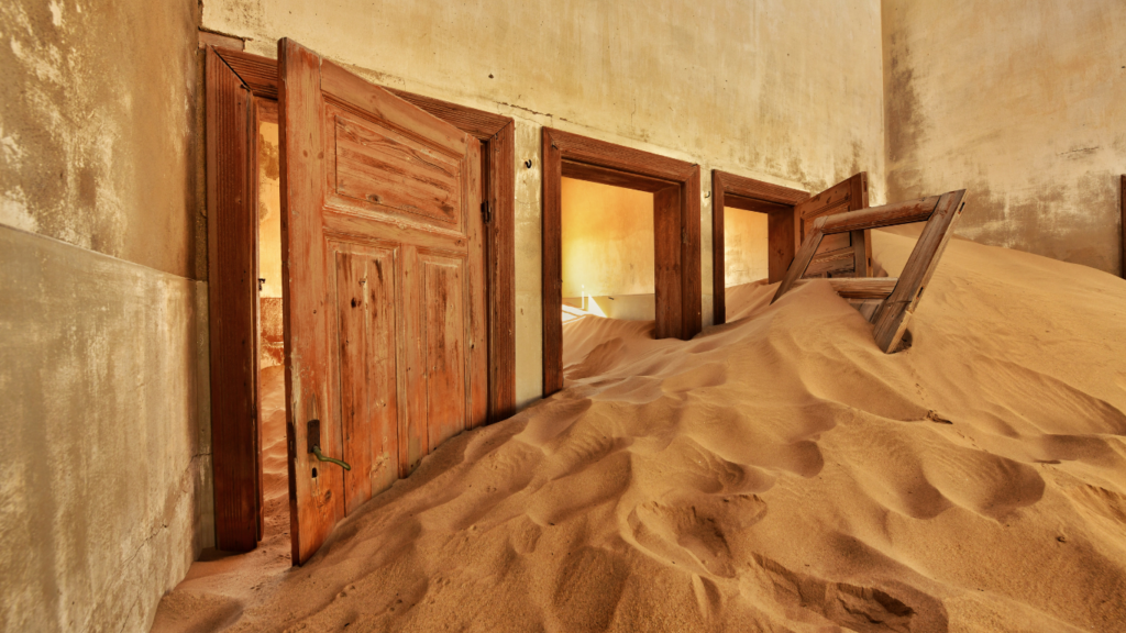 The Namib Desert moved in almost immediately after people left. Sand poured through windows and doors, filling buildings room by room. Without maintenance, structures decayed quickly. Today, many houses are half-buried or entirely filled with dunes, but their layouts remain clearly visible.