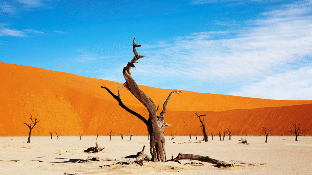 At its heart lies Deadvlei, the “dead marsh.” Here stand blackened trees, long dead yet perfectly preserved for six centuries, frozen in time by the arid air. Nearby is the Skeleton Coast, where shipwrecks rust among whale bones. Sailors once feared this place more than storms – because if the sea didn’t kill you, the desert would.